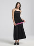 Its square neckline is adorned with black and pink lace in a graphic pattern, adding an artistic and sophisticated touch. At the hem, scalloped pink lace completes the design, evoking softness and femininity.